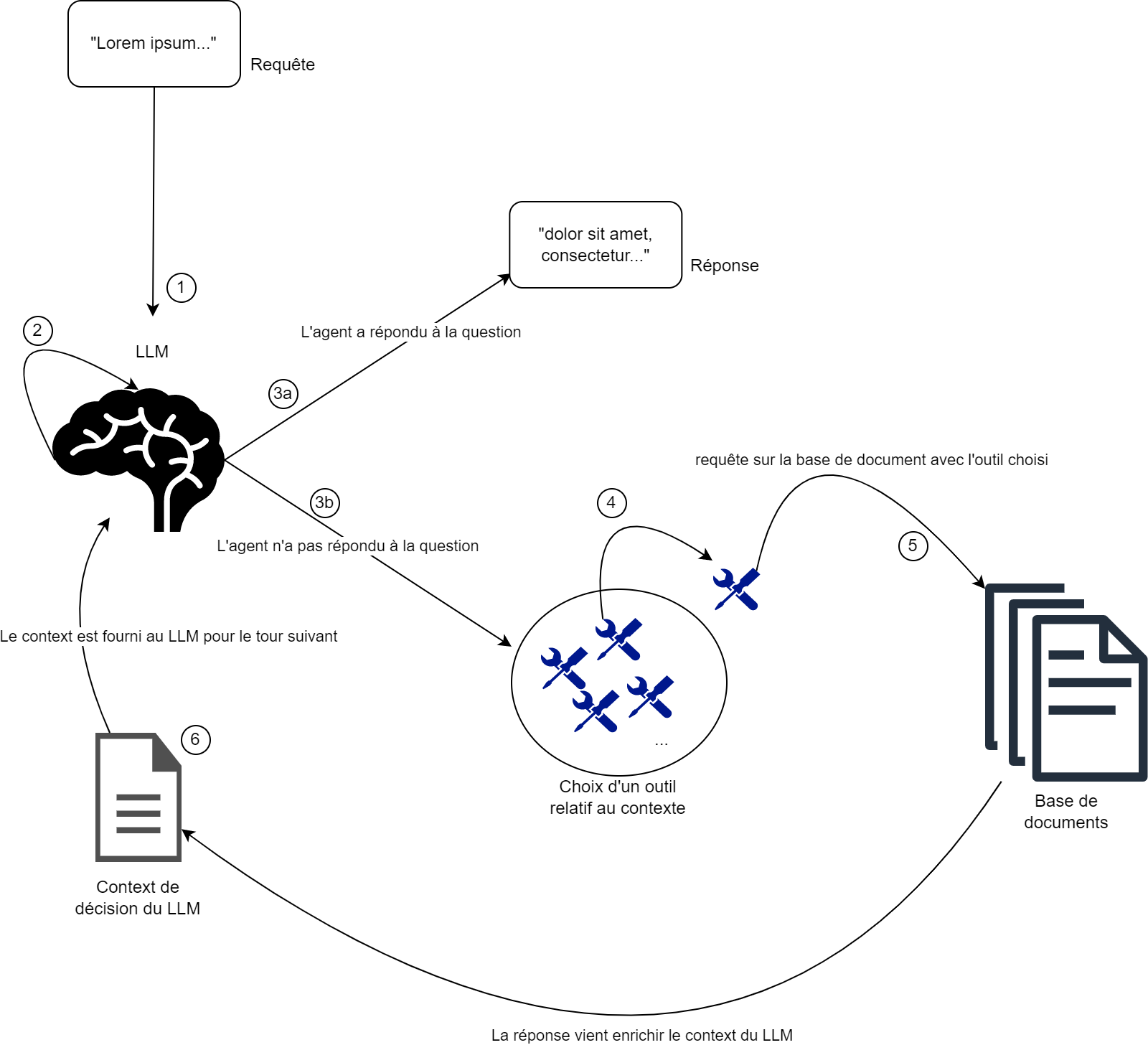 - 3b) et 4) Si non, il regarde les outils qu’il a à sa disposition (un outil est une pipeline de retrieval) et il choisit le plus pertinent pour son contexte et sa query